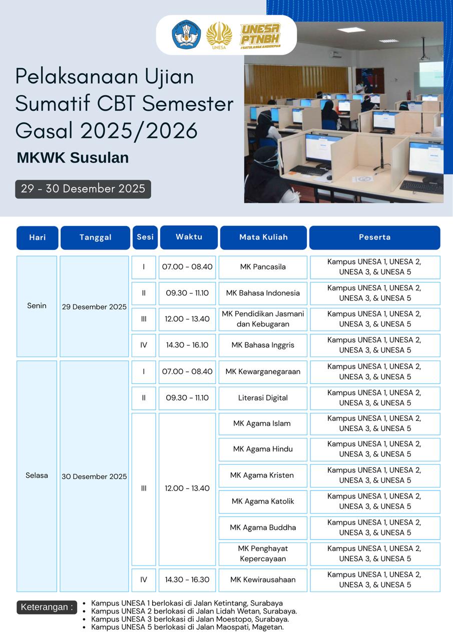 Berikut adalah informasi perubahan jadwal ujian susulan MKWK, dilaksanakan ditanggal 29-30 Desember 2025.