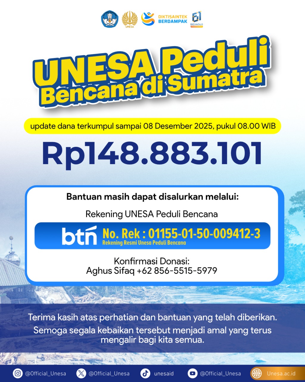UNESA CARES ABOUT THE DISASTER IN SUMATRA Funds collected as of December 8, 2025, at 8:00 a.m. WIBRp 148,883,101 Donations can still be made through:UNESA Disaster Relief AccountBTN Account