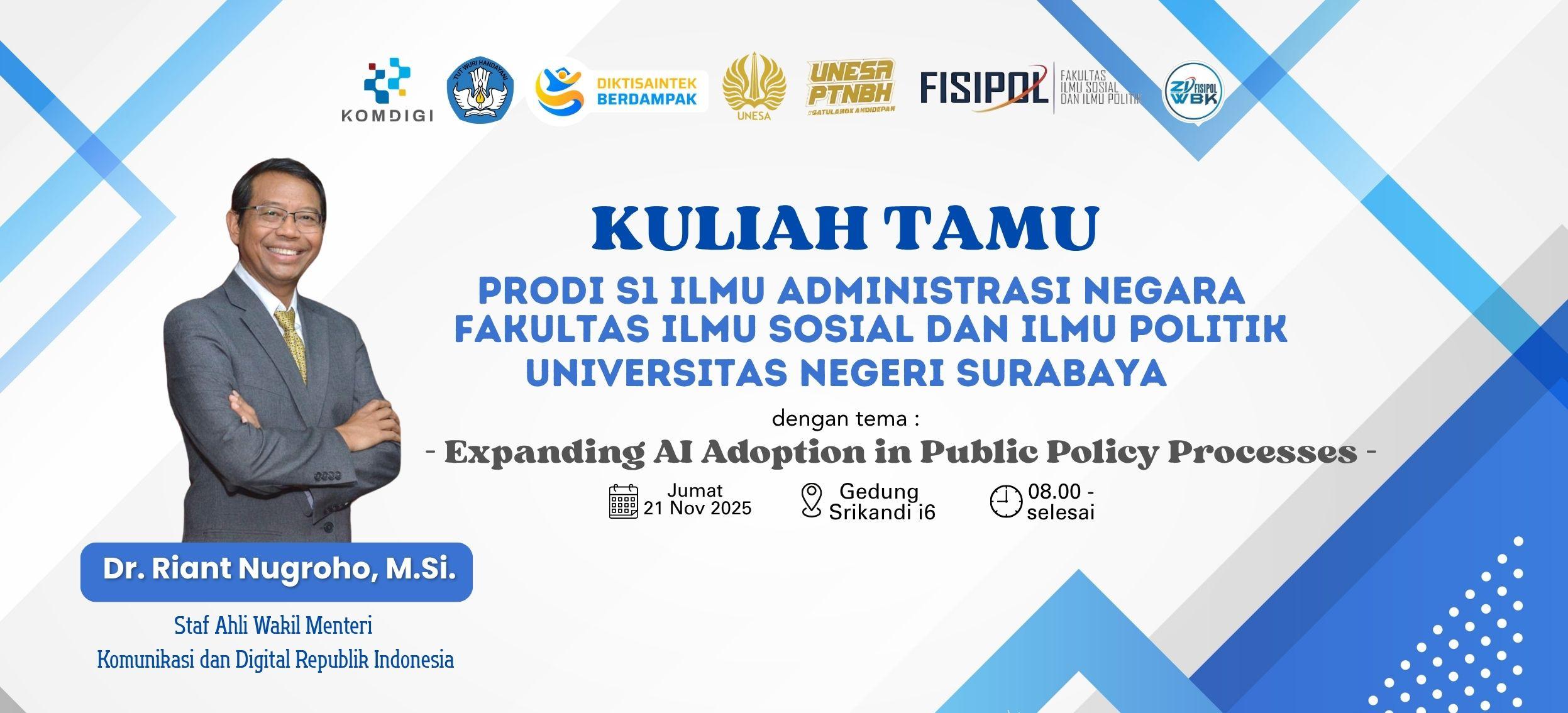 KULIAH TAMUPRODI S1 ILMU ADMINISTRASI NEGARA FAKULTAS ILMU SOSIAL DAN ILMU POLITIKUNIVERSITAS NEGERI SURABAYAdengan tema:-Expanding AI Adoption in Public Policy Processes-Narasumber: Dr. Riant Nugroho, M.