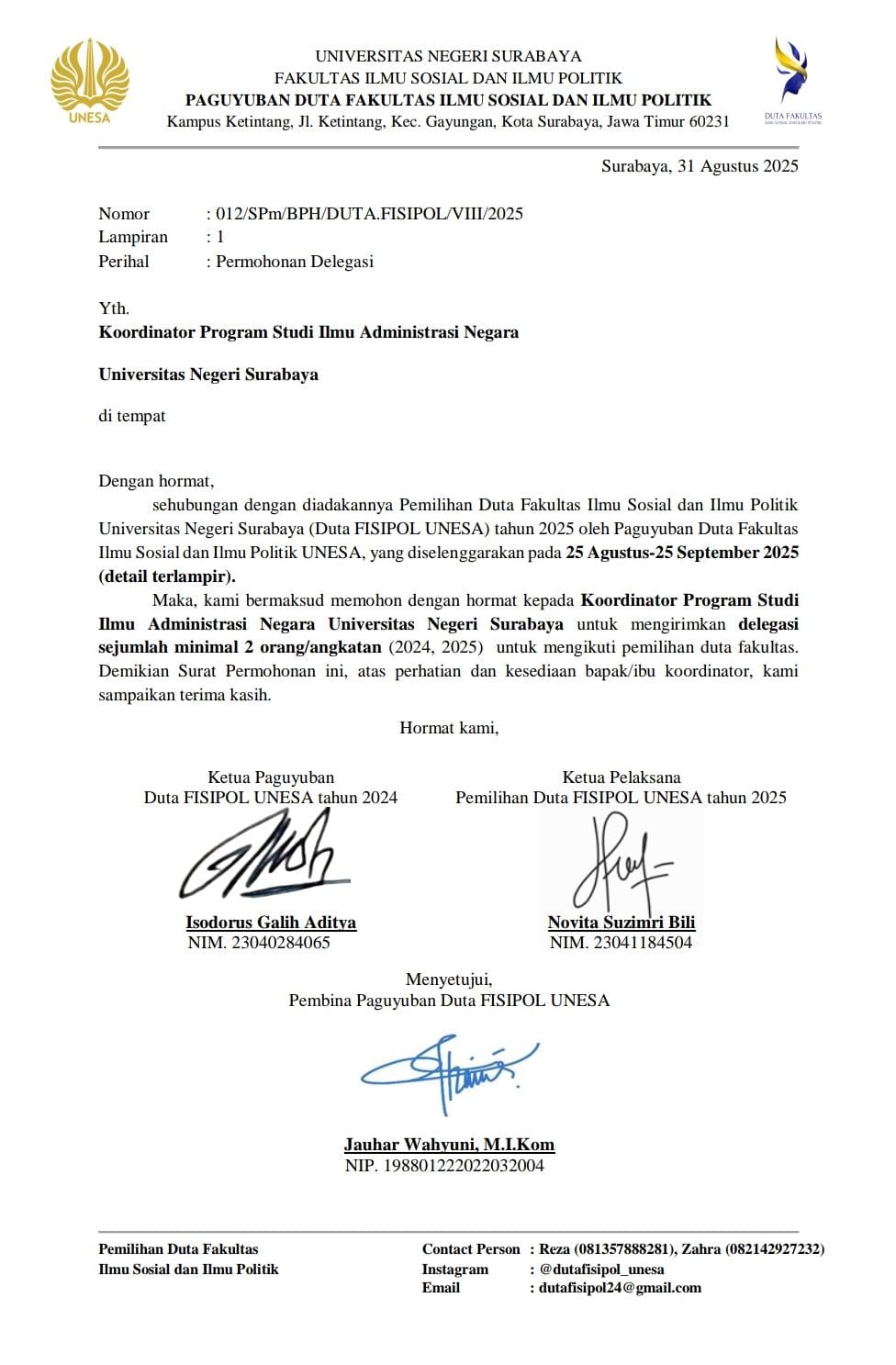 Paguyuban Duta Fakultas Ilmu Sosial dan Ilmu Politik (FISIPOL) Universitas Negeri Surabaya (UNESA) secara resmi mengajukan permohonan kepada Koordinator Program Studi Ilmu Administrasi Negara untuk mengirimkan
