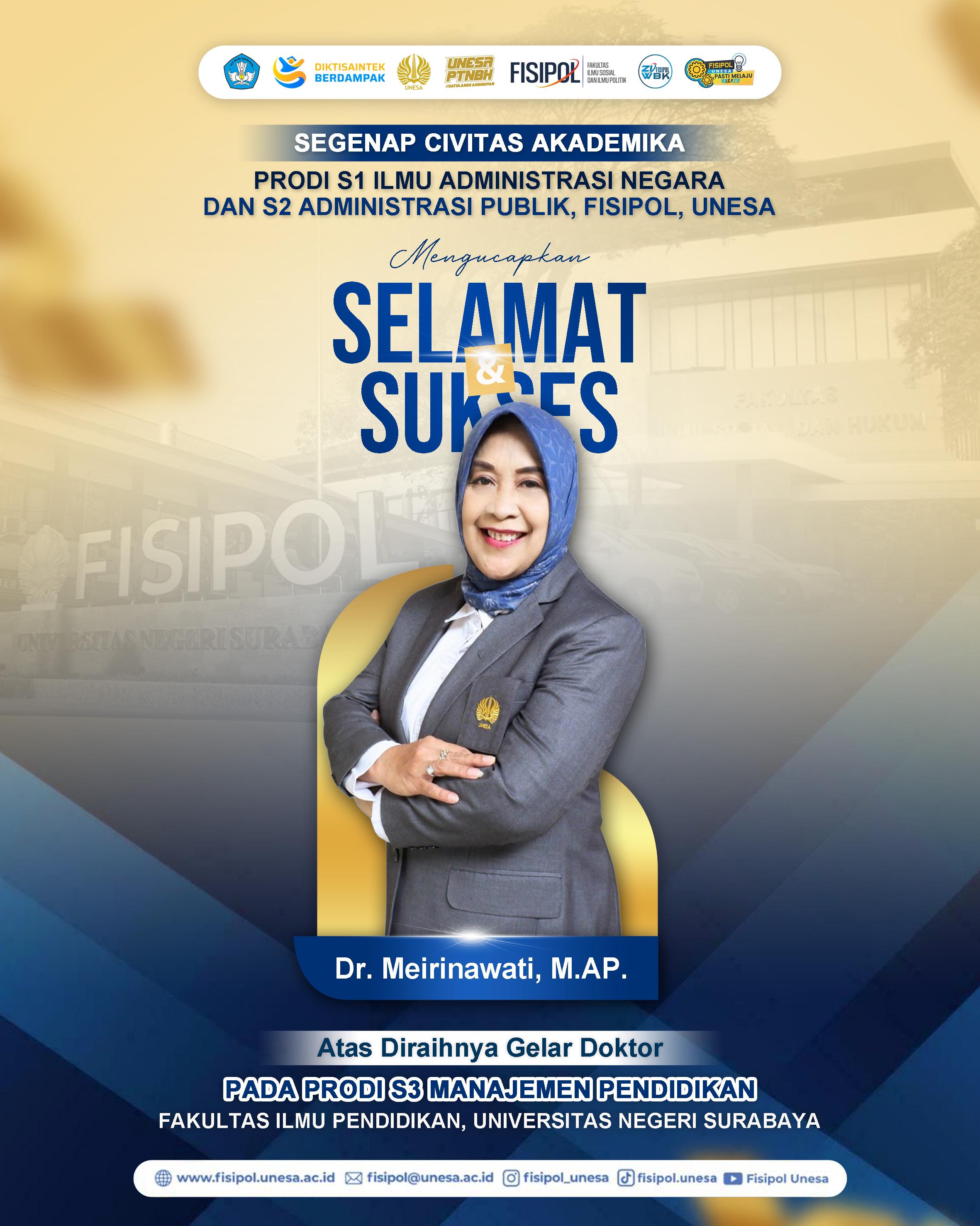 Segenap keluarga besar Program Studi Ilmu Administrasi Negara FISIPOL Universitas Negeri Surabaya mengucapkan selamat dan sukses kepada Dr. Meirinawati, M.AP. atas p
