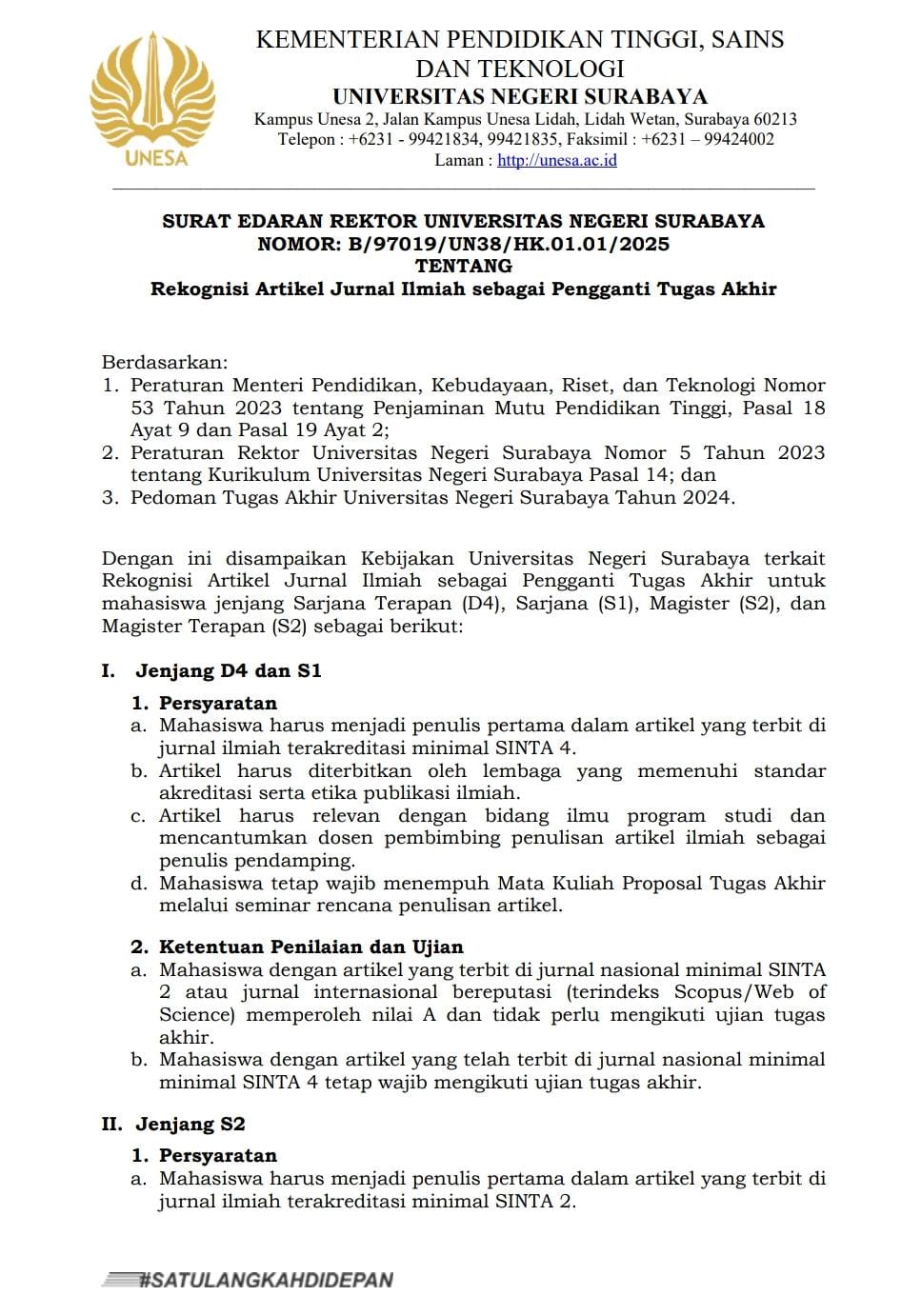 Universitas Negeri Surabaya resmi menetapkan kebijakan pengganti tugas akhir berupa publikasi artikel jurnal ilmiah untuk jenjang D4, S1, dan S2. Mahasiswa yang memenuhi syarat dapat menggantikan skripsi atau tesis dengan artikel yang terbit di ju